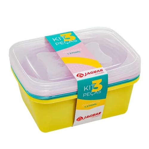 DESCRIÇÃO TÉCNICA: Os Potes são produzidos em plástico polipropileno, resistentes e de excelente qualidade. O Kit é composto por três potes com capacidade de 1,27 litros. Os potes são coloridos com cores vibrantes e tampas transparentes. As tampas possuem excelente vedação, ideal para organizar e separar seus alimentos. Livre de atóxicos e BPA.