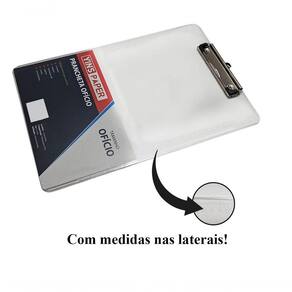 Principais Características:- Kit com 3 pranchetas tamanho ofício (35 x 24 cm)- Material: PS (poliestireno) transparente de alta qualidade- Prendedor metálico resistente com mola firme- Laterais com marcações de régua (em centímetros e milímetros)- Estrutura rígida e superfície lisa para escrita confortável- Visual cristalino e elegante, ideal para qualquer ambiente - Resistente, leve e fácil de limpar- , e !