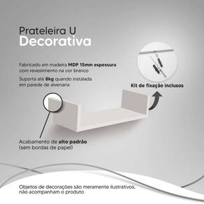 Obs.: Todos os itens de decoração das fotos não acompanham o produto. RBN: Casa/Decoração para Casa/Acessórios Decorativos/Prateleiras | Produto: Prateleira | Material: Madeira | Cor: Branco | Tonalidade: Branco | Estado de Origem: PR | Conteúdo da Embalagem: 3 Prateleiras U | Garantia: 3 meses contra defeitos de fabricação. | Instruções/Cuidados: Recomenda-se a limpeza com pano úmido. Não utilizar produtos abrasivos ou químicos. | Fabricante: Mercado das Prateleiras | Produto precisa de Montagem?: Sim, a montagem é simples mas sugerimos a contratação do nosso serviço de montagem (para os CEPs em que o serviço está disponível) ou de algum profissional experiente de sua preferência | Altura: 1.5 | Largura: 60 | Comprimento: 15 | Peso do produto: 4 | Altura do Produto com Embalagem: 1.5cm | Largura do Produto com Embalagem: 60cm | Comprimento Produto com Embalagem: 15cm | Peso do Produto com Embalagem: 3 | Descrição do Tamanho: Largura: 60cm x Comprimento: 15cm x Altura: 1,5cm | Acabamento: Fosco | Espessura: 15mm | Requere Montagem: Sim | Tipo de Prateleira: Flutuante | Inclui Kit de Instalação: Sim | Precisa de baterias ou pilhas: Não | Regulamentações aplicáveis a produtos perigosos: Não se aplica | Código de certificação: Não se aplica