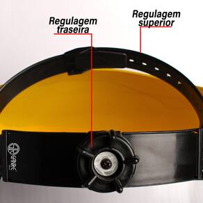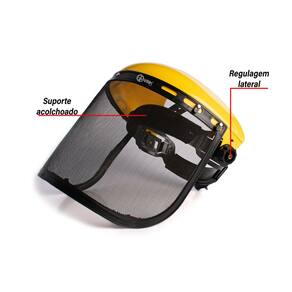 Protetor facial com ajuste de cabeça com catraca, material muito confortável. Proteção contra pequenos estilhaços de pedras, madeiras ou pequenos pedaços de objetos que são lançados contra o rosto ao manusear um equipamento de corte.
