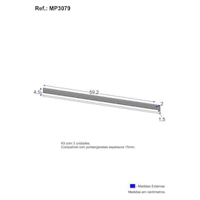 Dimensões de cada puxador: Altura: 4,5cm | Largura: 59,2cm | Profundidade: 2cm * Você pode consultar as medidas detalhadas na imagem técnica do produto. * Tamanho indicado para os parafusos: 3,5x12mm. * Quantidade total necessária de parafusos: 9.