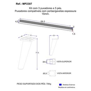 Dimensões do Produto: Puxador - Altura: 4,5cm | Largura: 59,2cm | Profundidade: 2cm Pé - Altura: 17,5cm | Largura: 9cm | Profundidade: 6cm * Você pode consultar as medidas detalhadas na imagem técnica do produto. * Parafusos indicados para os puxadores: 3,5x12mm (9 unidades). * Parafusos indicados para os pés: 4x16mm (20 unidades) | 4x45mm (5 unidades).