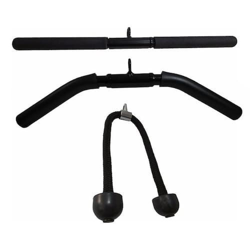----- kit 3 puxadores academia musculação treino ------ 03 unidades : 01 puxador reto com giro 50 cm , 01 puxador curvo com giro 50 cm, 01 puxador corda Puxadores reto e curvo 50 cm feitos em aço com pega emborrachada e soldas reforçadas, giro central e ótimo acabamento. Puxador corda tríceps feito em com corda trançada, reforçado e alta qualidade, alça de encaixe em aço cromado e apoio de mão em pvc, maciez nos exercícios evitando calos. Todos feitos em alta qualidade para serem usadas nos mais diversos aparelhos de sua academia, vai tornar seu treino mais completo, produto de , nacional e com . Especificações técnicas puxadores reto e curvo - material: tubo oco de aço 1020 - parede do aço: 2 mm - material argola: aço trefilado 1020 com 6,5 mm de espessura - material da pega: manopla emborracha de 1 1/4 32mm - todo soldado em mig soldas reforçadas - pintura eletrostática texturizada e anti-ferrugem - comprimento total do puxador: 50 cm - peso do produto unidade : 1 kg - cor: preto Especificações técnicas puxador corda - material: corda trançada em polipropileno virgem - diâmetro: 25 mm de espessura - material encaixe mosquetão: aço cromado com solda reforçada - material de apoio do punho: pvc maciço - corda profissional com alma de pvc maciço - comprimento total do puxador: 75 cm 37,5 cada lado pendurado - peso do produto unidade : 600 gramas - cor: preto Conteúdo: 01 puxador reto com giro 50 cm , 01 puxador curvo com giro 50 cm, 01 puxador corda