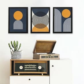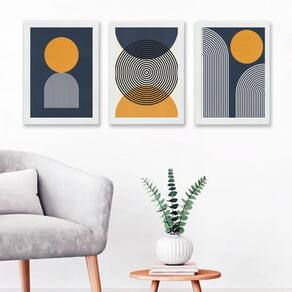 Kit 3 quadros abstratos azul e mostarda- círculos 45x34cm - com vidro Moldura: madeira branca Informações do produto tire todas as suas dúvidas no descritivo abaixo: decoração para quarto, sala, cozinha, escritório, área gourmet e muito mais. Chega de paredes vazias medidas - cada peça tem 45x34cm a3 . Material do papel - papel fotográfico brilhante de altíssima resolução acabamento - todos os quadros são acompanhados de vidro para proteção da imagem. - moldura em madeira maciça na cor preta ou branca conforme produto escolhido e pendurador . - os quadros são embalados de forma segura com plástico bolha com camada dupla de acordo com o tamanho dos quadros. Garantia - garantia de 3 meses. Meu quadro chegou. Como posso fixá-lo Você precisa apenas de um martelo e um prego, pois os quadros já vão acompanhados de penduradores. Esta é a forma mais indicada. Como posso limpar meu quadro A limpeza é feita como um móvel comum da sua casa. Apenas um pano seco ou espanador são suficientes para tal Ean: 7899066991864