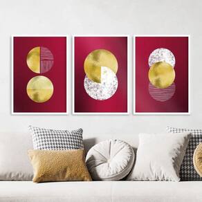 Com moldura de madeira preta, esses quadros abstratos são ideais para quem busca um estilo moderno e elegante. Seu design com círculos nas cores vinho e dourado trazem um charme único, destacando-se em qualquer parede.