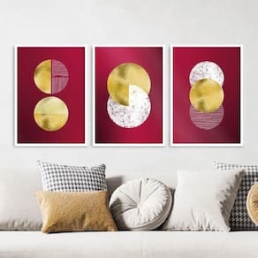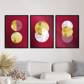 Composto por três quadros de 24x18cm cada, esse conjunto é ideal para decorar quartos, salas, cozinhas, escritórios, áreas gourmet e muito mais. Seu design abstrato, com círculos em tons de vinho e dourado, traz um ar contemporâneo e charmoso para qualquer parede.