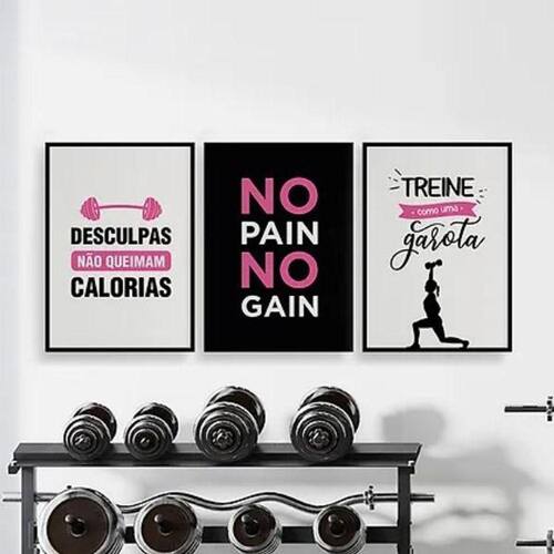 Kit 3 quadros academia feminino 33x24cm Moldura: madeira preta