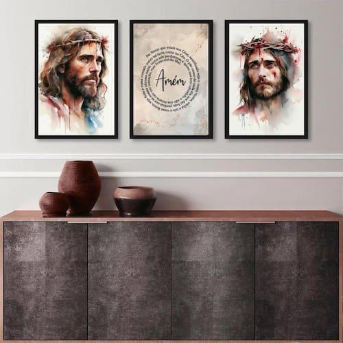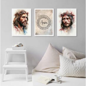 Kit 3 quadros aquarelas face de jesus - pai nosso 33x24cm - com vidro Moldura: madeira preta Informações do produto tire todas as suas dúvidas no descritivo abaixo: decoração para quarto, sala, cozinha, escritório, área gourmet e muito mais. Chega de paredes vazias medidas - cada peça tem 33x24cm a4 . Material do papel - papel fotográfico brilhante de altíssima resolução acabamento - todos os quadros são acompanhados de vidro para proteção da imagem. - moldura em madeira maciça na cor preta ou branca conforme produto escolhido e pendurador . - os quadros são embalados de forma segura com plástico bolha com camada dupla de acordo com o tamanho dos quadros. Garantia - garantia de 3 meses. Meu quadro chegou. Como posso fixá-lo Você precisa apenas de um martelo e um prego, pois os quadros já vão acompanhados de penduradores. Esta é a forma mais indicada. Como posso limpar meu quadro A limpeza é feita como um móvel comum da sua casa. Apenas um pano seco ou espanador são suficientes para tal