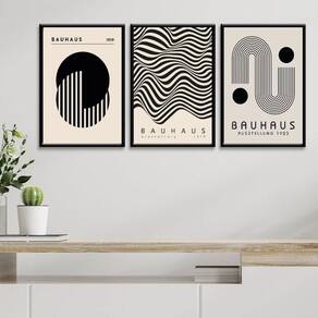 Kit 3 quadros arte bauhaus - preto e branco 45x34cm - com vidro Moldura: madeira branca Informações do produto tire todas as suas dúvidas no descritivo abaixo: decoração para quarto, sala, cozinha, escritório, área gourmet e muito mais. Chega de paredes vazias medidas - cada peça tem 45x34cm a3 . Material do papel - papel fotográfico brilhante de altíssima resolução acabamento - todos os quadros são acompanhados de vidro para proteção da imagem. - moldura em madeira maciça na cor preta ou branca conforme produto escolhido e pendurador . - os quadros são embalados de forma segura com plástico bolha com camada dupla de acordo com o tamanho dos quadros. Garantia - garantia de 3 meses. Meu quadro chegou. Como posso fixá-lo Você precisa apenas de um martelo e um prego, pois os quadros já vão acompanhados de penduradores. Esta é a forma mais indicada. Como posso limpar meu quadro A limpeza é feita como um móvel comum da sua casa. Apenas um pano seco ou espanador são suficientes para tal