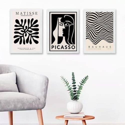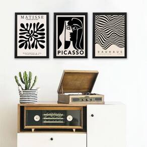 Kit 3 quadros artes matisse picasso bauhaus 45x34cm - com vidro Moldura: madeira branca Informações do produto tire todas as suas dúvidas no descritivo abaixo: decoração para quarto, sala, cozinha, escritório, área gourmet e muito mais. Chega de paredes vazias medidas - cada peça tem 45x34cm a3 . Material do papel - papel fotográfico brilhante de altíssima resolução acabamento - todos os quadros são acompanhados de vidro para proteção da imagem. - moldura em madeira maciça na cor preta ou branca conforme produto escolhido e pendurador . - os quadros são embalados de forma segura com plástico bolha com camada dupla de acordo com o tamanho dos quadros. Garantia - garantia de 3 meses. Meu quadro chegou. Como posso fixá-lo Você precisa apenas de um martelo e um prego, pois os quadros já vão acompanhados de penduradores. Esta é a forma mais indicada. Como posso limpar meu quadro A limpeza é feita como um móvel comum da sua casa. Apenas um pano seco ou espanador são suficientes para tal