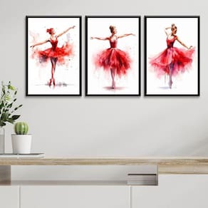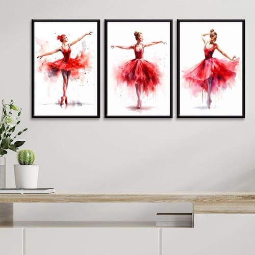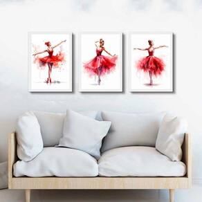 Kit 3 Quadros Bailarinas Vermelhas - Aquarela 45X34Cm
