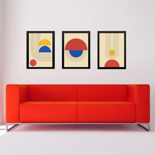 Kit 3 quadros bauhaus cores primárias 24x18cm - com vidro Cor: moldura preta Informações do produto tire todas as suas dúvidas no descritivo abaixo: decoração para quarto, sala, cozinha, escritório, área gourmet e muito mais. Chega de paredes vazias medidas - cada peça tem 24x18cm a5 . Material do papel - papel fotográfico brilhante de altíssima resolução acabamento - todos os quadros são acompanhados de vidro para proteção da imagem. - moldura em madeira maciça na cor preta ou branca conforme produto escolhido e pendurador . - os quadros são embalados de forma segura com plástico bolha com camada dupla de acordo com o tamanho dos quadros. Garantia - garantia de 3 meses. Meu quadro chegou. Como posso fixá-lo Você precisa apenas de um martelo e um prego, pois os quadros já vão acompanhados de penduradores. Esta é a forma mais indicada. Como posso limpar meu quadro A limpeza é feita como um móvel comum da sua casa. Apenas um pano seco ou espanador são suficientes para tal