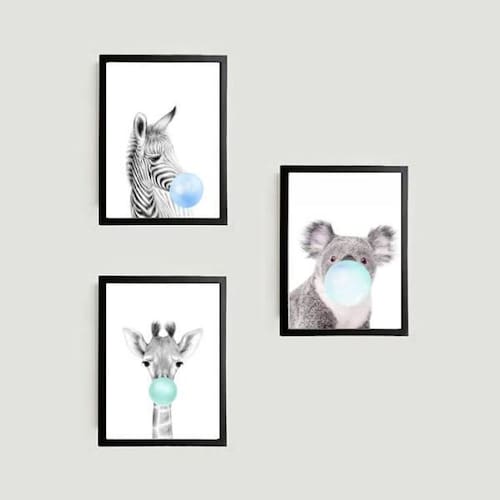 Kit 3 quadros bichinhos chicletes azul 45x34cm - com vidro Moldura: madeira preta Informações do produto tire todas as suas dúvidas no descritivo abaixo: decoração para quarto, sala, cozinha, escritório, área gourmet e muito mais. Chega de paredes vazias medidas - cada peça tem 45x34cm a3 . Material do papel - papel fotográfico brilhante de altíssima resolução acabamento - todos os quadros são acompanhados de vidro para proteção da imagem. - moldura em madeira maciça na cor preta e pendurador . - os quadros são embalados de forma segura com plástico bolha com camada dupla de acordo com o tamanho dos quadros. Garantia - garantia de 3 meses. Meu quadro chegou. Como posso fixá-lo Você precisa apenas de um martelo e um prego, pois os quadros já vão acompanhados de penduradores. Esta é a forma mais indicada. Como posso limpar meu quadro A limpeza é feita como um móvel comum da sua casa. Apenas um pano seco ou espanador são suficientes para tal