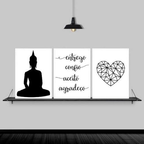 Kit 3 quadros buda mantra coração 33x24cm Moldura: madeira branca Informações do produto tire todas as suas dúvidas no descritivo abaixo: decoração para quarto, sala, cozinha, escritório, área gourmet e muito mais. Chega de paredes vazias medidas - cada peça tem 33x24cm a4 . Material do papel - papel fotográfico brilhante de altíssima resolução acabamento - todos os quadros são acompanhados de uma película de acetato para proteção da imagem. - os quadros são embalados de forma segura com plástico bolha com camada dupla de acordo com o tamanho dos quadros. Garantia - garantia de 3 meses. Meu quadro chegou. Como posso fixá-lo Você precisa apenas de um martelo e um prego, pois os quadros já vão acompanhados de penduradores. Esta é a forma mais indicada. Caso prefira, você pode utilizar uma fita dupla face neste caso, sugerimos de alta qualidade para evitar que descole e seu quadro caia . Como posso limpar meu quadro A limpeza é feita como um móvel comum da sua casa. Apenas um pano seco ou espanador são suficientes para tal Ean: 7892090583067