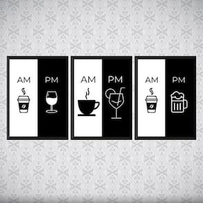 Kit 3 quadros café bebidas alcóolicas- am pm 33x24cm Moldura: madeira branca Informações do produto tire todas as suas dúvidas no descritivo abaixo: decoração para quarto, sala, cozinha, escritório, área gourmet e muito mais. Chega de paredes vazias medidas - cada peça tem 33x24cm a4 . Material do papel - papel fotográfico brilhante de altíssima resolução acabamento - todos os quadros são acompanhados de uma película de acetato para proteção da imagem. - os quadros são embalados de forma segura com plástico bolha com camada dupla de acordo com o tamanho dos quadros. Garantia - garantia de 3 meses. Meu quadro chegou. Como posso fixá-lo Você precisa apenas de um martelo e um prego, pois os quadros já vão acompanhados de penduradores. Esta é a forma mais indicada. Caso prefira, você pode utilizar uma fita dupla face neste caso, sugerimos de alta qualidade para evitar que descole e seu quadro caia . Como posso limpar meu quadro A limpeza é feita como um móvel comum da sua casa. Apenas um pano seco ou espanador são suficientes para tal