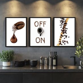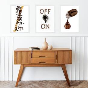 Kit 3 quadros café grãos - on off 24x18cm - com vidro Cor: moldura preta Informações do produto tire todas as suas dúvidas no descritivo abaixo: decoração para quarto, sala, cozinha, escritório, área gourmet e muito mais. Chega de paredes vazias medidas - cada peça tem 24x18cm a5 . Material do papel - papel fotográfico brilhante de altíssima resolução acabamento - todos os quadros são acompanhados de vidro para proteção da imagem. - moldura em madeira maciça na cor preta ou branca conforme produto escolhido e pendurador . - os quadros são embalados de forma segura com plástico bolha com camada dupla de acordo com o tamanho dos quadros. Garantia - garantia de 3 meses. Meu quadro chegou. Como posso fixá-lo Você precisa apenas de um martelo e um prego, pois os quadros já vão acompanhados de penduradores. Esta é a forma mais indicada. Como posso limpar meu quadro A limpeza é feita como um móvel comum da sua casa. Apenas um pano seco ou espanador são suficientes para tal