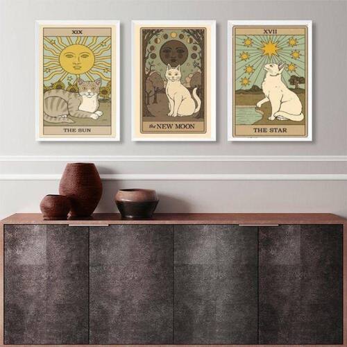 Kit 3 quadros cartas tarot gatos- the sun, the moon, the star 33x24cm - com vidro Moldura: madeira branca Informações do produto tire todas as suas dúvidas no descritivo abaixo: decoração para quarto, sala, cozinha, escritório, área gourmet e muito mais. Chega de paredes vazias medidas - cada peça tem 33x24cm a4 . Material do papel - papel fotográfico brilhante de altíssima resolução acabamento - todos os quadros são acompanhados de vidro para proteção da imagem. - moldura em madeira maciça na cor preta ou branca conforme produto escolhido e pendurador . - os quadros são embalados de forma segura com plástico bolha com camada dupla de acordo com o tamanho dos quadros. Garantia - garantia de 3 meses. Meu quadro chegou. Como posso fixá-lo Você precisa apenas de um martelo e um prego, pois os quadros já vão acompanhados de penduradores. Esta é a forma mais indicada. Como posso limpar meu quadro A limpeza é feita como um móvel comum da sua casa. Apenas um pano seco ou espanador são suficientes para tal Ean: 7893602273919
