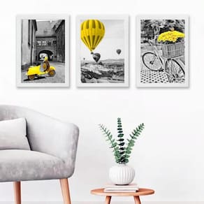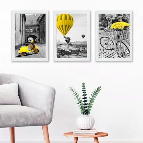 O Kit 3 Quadros Fotografias Cidades Preto Branco Amarelo é perfeito para dar um toque especial à decoração do seu quarto, sala, cozinha, escritório, área gourmet e muito mais. Chega de paredes vazias!