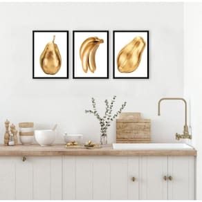 Kit 3 quadros cozinha frutas douradas 33x24cm - com vidro Cor: moldura preta Informações do produto tire todas as suas dúvidas no descritivo abaixo: decoração para quarto, sala, cozinha, escritório, área gourmet e muito mais. Chega de paredes vazias medidas - cada peça tem 33x24cm a4 . Material do papel - papel fotográfico brilhante de altíssima resolução acabamento - todos os quadros são acompanhados de vidro para proteção da imagem. - moldura em madeira maciça na cor preta ou branca conforme produto escolhido e pendurador . - os quadros são embalados de forma segura com plástico bolha com camada dupla de acordo com o tamanho dos quadros. Garantia - garantia de 3 meses. Meu quadro chegou. Como posso fixá-lo Você precisa apenas de um martelo e um prego, pois os quadros já vão acompanhados de penduradores. Esta é a forma mais indicada. Como posso limpar meu quadro A limpeza é feita como um móvel comum da sua casa. Apenas um pano seco ou espanador são suficientes para tal