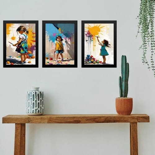 Kit 3 quadros decorativos artes crianças pintando 24x18cm Cor: moldura preta Informações do produto tire todas as suas dúvidas no descritivo abaixo: decoração para quarto, sala, cozinha, escritório, área gourmet e muito mais. Chega de paredes vazias medidas - cada peça tem 24x18cm a5 . Material do papel - papel fotográfico brilhante de altíssima resolução acabamento - todos os quadros são acompanhados de uma película de acetato para proteção da imagem. - os quadros são embalados de forma segura com plástico bolha com camada dupla de acordo com o tamanho dos quadros. Garantia - garantia de 3 meses. Meu quadro chegou. Como posso fixá-lo Você precisa apenas de um martelo e um prego, pois os quadros já vão acompanhados de penduradores. Esta é a forma mais indicada. Caso prefira, você pode utilizar uma fita dupla face neste caso, sugerimos de alta qualidade para evitar que descole e seu quadro caia . Como posso limpar meu quadro A limpeza é feita como um móvel comum da sua casa. Apenas um pano seco ou espanador são suficientes para tal