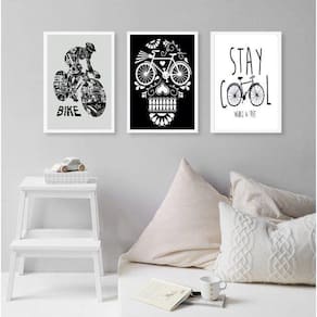 Kit 3 quadros decorativos cantinho do ciclista 33x24cm Moldura: madeira branca Informações do produto tire todas as suas dúvidas no descritivo abaixo: decoração para quarto, sala, cozinha, escritório, área gourmet e muito mais. Chega de paredes vazias medidas - cada peça tem 33x24cm a4 . Material do papel - papel fotográfico brilhante de altíssima resolução acabamento - todos os quadros são acompanhados de uma película de acetato para proteção da imagem. - os quadros são embalados de forma segura com plástico bolha com camada dupla de acordo com o tamanho dos quadros. Garantia - garantia de 3 meses. Meu quadro chegou. Como posso fixá-lo Você precisa apenas de um martelo e um prego, pois os quadros já vão acompanhados de penduradores. Esta é a forma mais indicada. Caso prefira, você pode utilizar uma fita dupla face neste caso, sugerimos de alta qualidade para evitar que descole e seu quadro caia . Como posso limpar meu quadro A limpeza é feita como um móvel comum da sua casa. Apenas um pano seco ou espanador são suficientes para tal Ean: 7898163447670