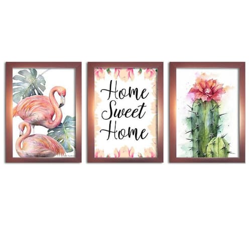 Kit 3 Quadros Decorativos com Moldura Rose Home Flamingo Quadros decorativos fabricados com moldura de madeira de reflorestamento com acabamento laqueado, impressão a laser em papel couché 300g, fundo em madeira. As paredes ganham cor e vida com quadros e painéis decorativos. Escolha os modelos que faltam para deixar sua decoração ainda mais bonita. Na sala, no quarto ou em outros cômodos, as peças coloridas ou em preto e branco garantem mais estilo.