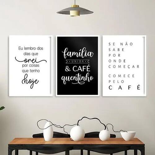Kit 3 quadros decorativos família e café 45x34cm Cor: moldura branca Informações do produto tire todas as suas dúvidas no descritivo abaixo: decoração para quarto, sala, cozinha, escritório, área gourmet e muito mais. Chega de paredes vazias. Medidas - cada peça tem 45x34cm a3 . Material do papel - papel fotográfico brilhante de altíssima resolução acabamento - todos os quadros são acompanhados de uma película de acetato para proteção da imagem. - os quadros são embalados de forma segura com plástico bolha com camada dupla de acordo com o tamanho dos quadros. - de 3 meses. Meu quadro chegou. Como posso fixá-lo Você precisa apenas de um martelo e um prego, pois os quadros já vão acompanhados de penduradores. Esta é a forma mais indicada. Caso prefira, você pode utilizar uma fita dupla face neste caso, sugerimos de alta qualidade para evitar que descole e seu quadro caia . Como posso limpar meu quadro A limpeza é feita como um móvel comum da sua casa. Apenas um pano seco ou espanador são suficientes para tal Marca: Não Informado