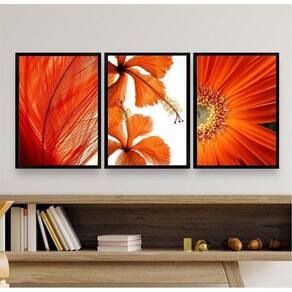 Kit 3 quadros decorativos modernos flores laranjas 24x18cm - com vidro Moldura: madeira preta Informações do produto tire todas as suas dúvidas no descritivo abaixo: decoração para quarto, sala, cozinha, escritório, área gourmet e muito mais. Chega de paredes vazias medidas - cada peça tem 24x18cm a5 . Material do papel - papel fotográfico brilhante de altíssima resolução acabamento - todos os quadros são acompanhados de vidro para proteção da imagem. - moldura em madeira maciça na cor preta ou branca conforme produto escolhido e pendurador . - os quadros são embalados de forma segura com plástico bolha com camada dupla de acordo com o tamanho dos quadros. Garantia - garantia de 3 meses. Meu quadro chegou. Como posso fixá-lo Você precisa apenas de um martelo e um prego, pois os quadros já vão acompanhados de penduradores. Esta é a forma mais indicada. Como posso limpar meu quadro A limpeza é feita como um móvel comum da sua casa. Apenas um pano seco ou espanador são suficientes para tal Ean: 7891543882894