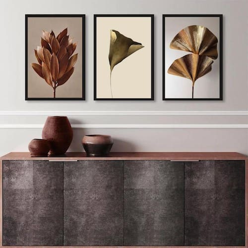 Kit 3 quadros elegantes flores marrom e dourado 33x24cm - com vidro Moldura: madeira preta Informações do produto tire todas as suas dúvidas no descritivo abaixo: decoração para quarto, sala, cozinha, escritório, área gourmet e muito mais. Chega de paredes vazias medidas - cada peça tem 33x24cm a4 . Material do papel - papel fotográfico brilhante de altíssima resolução acabamento - todos os quadros são acompanhados de vidro para proteção da imagem. - moldura em madeira maciça na cor preta ou branca conforme produto escolhido e pendurador . - os quadros são embalados de forma segura com plástico bolha com camada dupla de acordo com o tamanho dos quadros. Garantia - garantia de 3 meses. Meu quadro chegou. Como posso fixá-lo Você precisa apenas de um martelo e um prego, pois os quadros já vão acompanhados de penduradores. Esta é a forma mais indicada. Como posso limpar meu quadro A limpeza é feita como um móvel comum da sua casa. Apenas um pano seco ou espanador são suficientes para tal Ean: 7892629247392