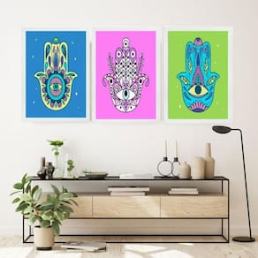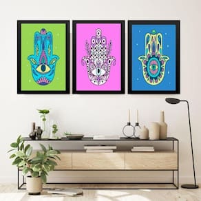 Kit 3 quadros esotéricos olhos gregos hamsa 33x24cm - com vidro Cor: moldura preta Informações do produto tire todas as suas dúvidas no descritivo abaixo: decoração para quarto, sala, cozinha, escritório, área gourmet e muito mais. Chega de paredes vazias medidas - cada peça tem 33x24cm a4 . Material do papel - papel fotográfico brilhante de altíssima resolução acabamento - todos os quadros são acompanhados de vidro para proteção da imagem. - moldura em madeira maciça na cor preta ou branca conforme produto escolhido e pendurador . - os quadros são embalados de forma segura com plástico bolha com camada dupla de acordo com o tamanho dos quadros. Garantia - garantia de 3 meses. Meu quadro chegou. Como posso fixá-lo Você precisa apenas de um martelo e um prego, pois os quadros já vão acompanhados de penduradores. Esta é a forma mais indicada. Como posso limpar meu quadro A limpeza é feita como um móvel comum da sua casa. Apenas um pano seco ou espanador são suficientes para tal
