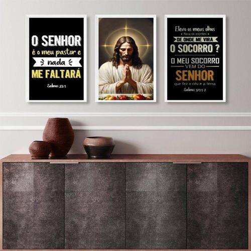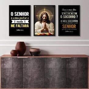 Kit 3 quadros evangélicos para cozinha- o senhor é meu pastor 45x34cm - com vidro Moldura: madeira preta Informações do produto tire todas as suas dúvidas no descritivo abaixo: decoração para quarto, sala, cozinha, escritório, área gourmet e muito mais. Chega de paredes vazias medidas - cada peça tem 45x34cm a3 . Material do papel - papel fotográfico brilhante de altíssima resolução acabamento - todos os quadros são acompanhados de vidro para proteção da imagem. - moldura em madeira maciça na cor preta ou branca conforme produto escolhido e pendurador . - os quadros são embalados de forma segura com plástico bolha com camada dupla de acordo com o tamanho dos quadros. Garantia - garantia de 3 meses. Meu quadro chegou. Como posso fixá-lo Você precisa apenas de um martelo e um prego, pois os quadros já vão acompanhados de penduradores. Esta é a forma mais indicada. Como posso limpar meu quadro A limpeza é feita como um móvel comum da sua casa. Apenas um pano seco ou espanador são suficientes para tal Ean: 7893141951866