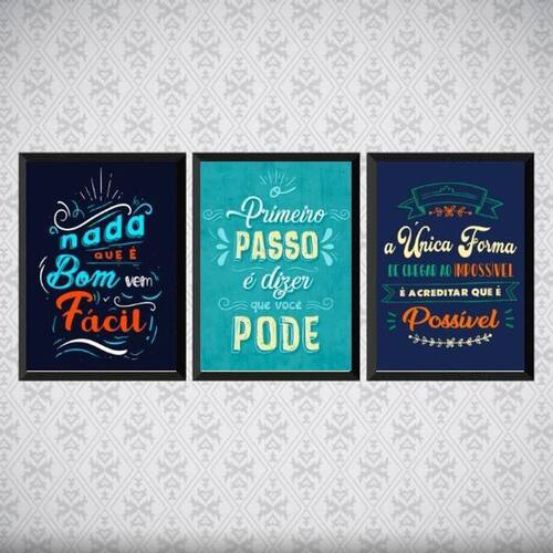 Kit 3 quadros frases motivacionais corporativas 24x18cm - com vidro Moldura: madeira branca Informações do produto Decoração para quarto, sala, cozinha, escritório, área gourmet e muito mais. Chega de paredes vazias medidas - cada peça tem 24x18cm a5 . Material do papel - papel fotográfico brilhante de altíssima resolução Acabamento - todos os quadros são acompanhados de vidro para proteção da imagem. - moldura em madeira maciça e pendurador. - os quadros são embalados de forma segura com plástico bolha com camada dupla de acordo com o tamanho dos quadros. Garantia - garantia de 3 meses. Meu quadro chegou. Como posso fixá-lo Você precisa apenas de um martelo e um prego, pois os quadros já vão acompanhados de penduradores. Esta é a forma mais indicada. Como posso limpar meu quadro A limpeza é feita como um móvel comum da sua casa. Apenas um pano seco ou espanador são suficientes para tal