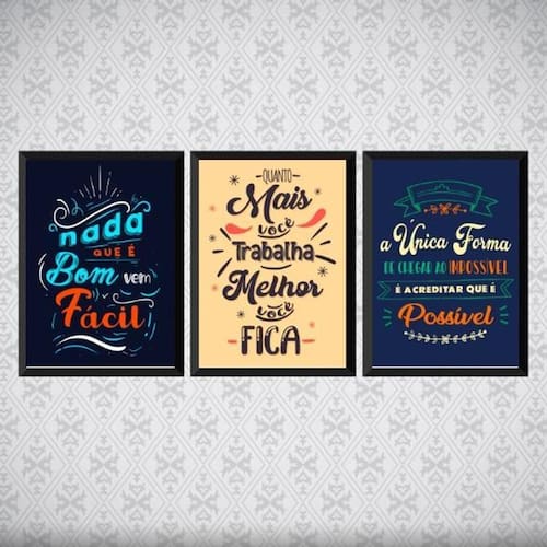 Kit 3 quadros frases motivacionais de trabalho 45x34cm Moldura: madeira preta Informações do produto Decoração para quarto, sala, cozinha, escritório, área gourmet e muito mais. Chega de paredes vazias medidas - cada peça tem 45x34cm a3 . Material do papel - papel fotográfico brilhante de altíssima resolução Acabamento - todos os quadros são acompanhados de uma película de acetato para proteção da imagem. - os quadros são embalados de forma segura com plástico bolha com camada dupla de acordo com o tamanho dos quadros. - de 3 meses. Meu quadro chegou. Como posso fixá-lo Você precisa apenas de um martelo e um prego, pois os quadros já vão acompanhados de penduradores. Esta é a forma mais indicada. Como posso limpar meu quadro A limpeza é feita como um móvel comum da sua casa. Apenas um pano seco ou espanador são suficientes para tal