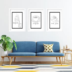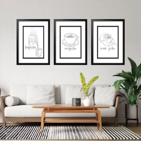 Kit 3 quadros grandes café respira inspira não pira 60x48cm Cor: moldura branca Informações do produto tire todas as suas dúvidas no descritivo abaixo: decoração para quarto, sala, cozinha, escritório, área gourmet e muito mais. Chega de paredes vazias medidas - cada peça tem 60x48cm . Material do papel - papel fotográfico brilhante de altíssima resolução acabamento - todos os quadros são acompanhados de vidro para proteção da imagem. - moldura em madeira maciça na cor preta ou branca conforme produto escolhido e pendurador. - paspatur branco com 7cm de largura - os quadros são embalados de forma segura com plástico bolha com camada dupla de acordo com o tamanho dos quadros. - de 3 meses. Meu quadro chegou. Como posso fixá-lo Você precisa apenas de um martelo e um prego, pois os quadros já vão acompanhados de penduradores. Esta é a forma mais indicada. Como posso limpar meu quadro A limpeza é feita como um móvel comum da sua casa. Apenas um pano seco ou espanador são suficientes para tal