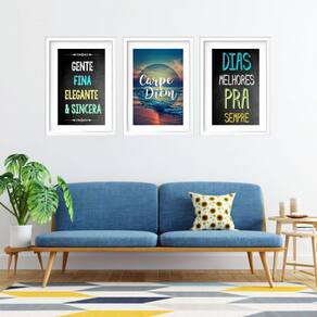 Kit 3 quadros grandes carpe diem 60x48cm Cor: moldura branca Informações do produto tire todas as suas dúvidas no descritivo abaixo: decoração para quarto, sala, cozinha, escritório, área gourmet e muito mais. Chega de paredes vazias medidas - cada peça tem 60x48cm . Material do papel - papel fotográfico brilhante de altíssima resolução acabamento - todos os quadros são acompanhados de vidro para proteção da imagem. - moldura em madeira maciça na cor preta ou branca conforme produto escolhido e pendurador. - paspatur branco com 7cm de largura - os quadros são embalados de forma segura com plástico bolha com camada dupla de acordo com o tamanho dos quadros. - de 3 meses. Meu quadro chegou. Como posso fixá-lo Você precisa apenas de um martelo e um prego, pois os quadros já vão acompanhados de penduradores. Esta é a forma mais indicada. Como posso limpar meu quadro A limpeza é feita como um móvel comum da sua casa. Apenas um pano seco ou espanador são suficientes para tal