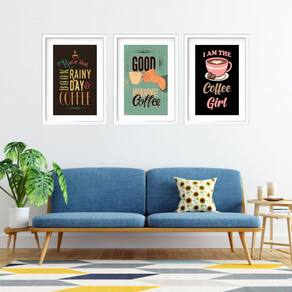 Kit 3 quadros grandes coffee day 60x48cm Cor: moldura branca Informações do produto tire todas as suas dúvidas no descritivo abaixo: decoração para quarto, sala, cozinha, escritório, área gourmet e muito mais. Chega de paredes vazias medidas - cada peça tem 60x48cm . Material do papel - papel fotográfico brilhante de altíssima resolução acabamento - todos os quadros são acompanhados de vidro para proteção da imagem. - moldura em madeira maciça na cor preta ou branca conforme produto escolhido e pendurador. - paspatur branco com 7cm de largura - os quadros são embalados de forma segura com plástico bolha com camada dupla de acordo com o tamanho dos quadros. - de 3 meses. Meu quadro chegou. Como posso fixá-lo Você precisa apenas de um martelo e um prego, pois os quadros já vão acompanhados de penduradores. Esta é a forma mais indicada. Como posso limpar meu quadro A limpeza é feita como um móvel comum da sua casa. Apenas um pano seco ou espanador são suficientes para tal