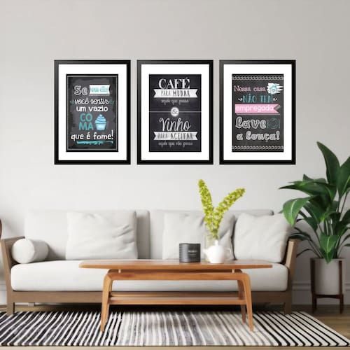 Kit 3 Quadros Grandes Cozinha Quadro Negro 60x48cm - Cor: Moldura Branca