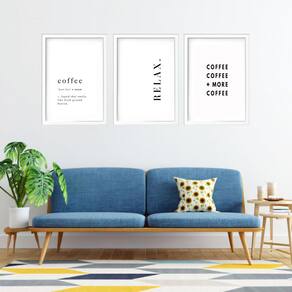 Kit 3 quadros grandes relax coffee 60x48cm Cor: moldura preta Informações do produto tire todas as suas dúvidas no descritivo abaixo: decoração para quarto, sala, cozinha, escritório, área gourmet e muito mais. Chega de paredes vazias medidas - cada peça tem 60x48cm . Material do papel - papel fotográfico brilhante de altíssima resolução acabamento - todos os quadros são acompanhados de vidro para proteção da imagem. - moldura em madeira maciça na cor preta ou branca conforme produto escolhido e pendurador. - paspatur branco com 7cm de largura - os quadros são embalados de forma segura com plástico bolha com camada dupla de acordo com o tamanho dos quadros. - de 3 meses. Meu quadro chegou. Como posso fixá-lo Você precisa apenas de um martelo e um prego, pois os quadros já vão acompanhados de penduradores. Esta é a forma mais indicada. Como posso limpar meu quadro A limpeza é feita como um móvel comum da sua casa. Apenas um pano seco ou espanador são suficientes para tal