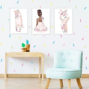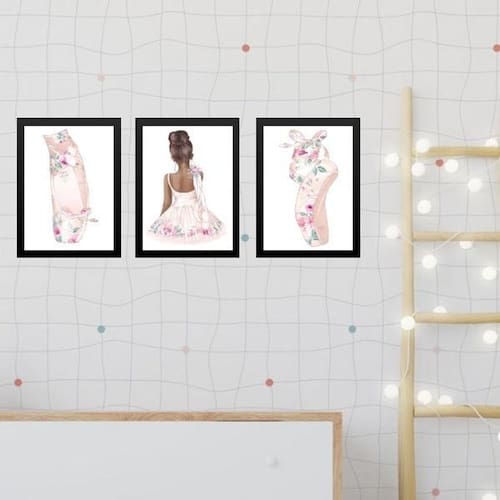 Kit 3 quadros infantis bailarinas morenas 33x24cm - com vidro Moldura: madeira branca Informações do produto tire todas as suas dúvidas no descritivo abaixo: decoração para quarto, sala, cozinha, escritório, área gourmet e muito mais. Chega de paredes vazias medidas - cada peça tem 33x24cm a4 . Material do papel - papel fotográfico brilhante de altíssima resolução acabamento - todos os quadros são acompanhados de vidro para proteção da imagem. - moldura em madeira maciça na cor preta ou branca conforme produto escolhido e pendurador . - os quadros são embalados de forma segura com plástico bolha com camada dupla de acordo com o tamanho dos quadros. Garantia - garantia de 3 meses. Meu quadro chegou. Como posso fixá-lo Você precisa apenas de um martelo e um prego, pois os quadros já vão acompanhados de penduradores. Esta é a forma mais indicada. Como posso limpar meu quadro A limpeza é feita como um móvel comum da sua casa. Apenas um pano seco ou espanador são suficientes para tal