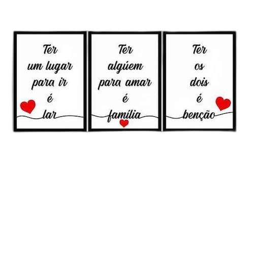 Kit 3 quadros lar, família, benção - branco 60x40cm Moldura: madeira preta Informações do produto tire todas as suas dúvidas no descritivo abaixo: decoração para quarto, sala, cozinha, escritório, área gourmet e muito mais. Chega de paredes vazias medidas - cada peça tem 60x42cm a2 . Material do papel - papel fotográfico brilhante de altíssima resolução acabamento - todos os quadros são acompanhados de uma película de acetato para proteção da imagem. - os quadros são embalados de forma segura com plástico bolha com camada dupla de acordo com o tamanho dos quadros. - de 3 meses. Meu quadro chegou. Como posso fixá-lo Você precisa apenas de um martelo e um prego, pois os quadros já vão acompanhados de penduradores. Esta é a forma mais indicada. Caso prefira, você pode utilizar uma fita dupla face neste caso, sugerimos de alta qualidade para evitar que descole e seu quadro caia . Como posso limpar meu quadro A limpeza é feita como um móvel comum da sua casa. Apenas um pano seco ou espanador são suficientes para tal