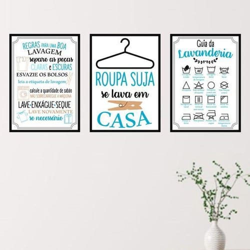 Kit 3 quadros lavanderia azul 45x34cm - com vidro Moldura: madeira preta Informações do produto tire todas as suas dúvidas no descritivo abaixo: decoração para quarto, sala, cozinha, escritório, área gourmet e muito mais. Chega de paredes vazias medidas - cada peça tem 45x34cm a3 . Material do papel - papel fotográfico brilhante de altíssima resolução acabamento - todos os quadros são acompanhados de vidro para proteção da imagem. - moldura em madeira maciça na cor preta e pendurador . - os quadros são embalados de forma segura com plástico bolha com camada dupla de acordo com o tamanho dos quadros. Garantia - garantia de 3 meses. Meu quadro chegou. Como posso fixá-lo Você precisa apenas de um martelo e um prego, pois os quadros já vão acompanhados de penduradores. Esta é a forma mais indicada. Como posso limpar meu quadro A limpeza é feita como um móvel comum da sua casa. Apenas um pano seco ou espanador são suficientes para tal
