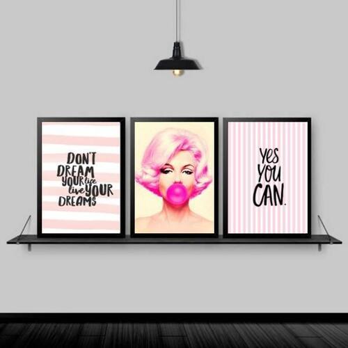 Kit 3 quadros marilyn life your dreams 33x24cm - com vidro Moldura: madeira preta Informações do produto tire todas as suas dúvidas no descritivo abaixo: decoração para quarto, sala, cozinha, escritório, área gourmet e muito mais. Chega de paredes vazias medidas - cada peça tem 33x24cm a4 . Material do papel - papel fotográfico brilhante de altíssima resolução acabamento - todos os quadros são acompanhados de vidro para proteção da imagem. - moldura em madeira maciça na cor preta e pendurador . - os quadros são embalados de forma segura com plástico bolha com camada dupla de acordo com o tamanho dos quadros. Garantia - garantia de 3 meses. Meu quadro chegou. Como posso fixá-lo Você precisa apenas de um martelo e um prego, pois os quadros já vão acompanhados de penduradores. Esta é a forma mais indicada. Como posso limpar meu quadro A limpeza é feita como um móvel comum da sua casa. Apenas um pano seco ou espanador são suficientes para tal