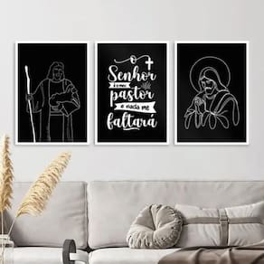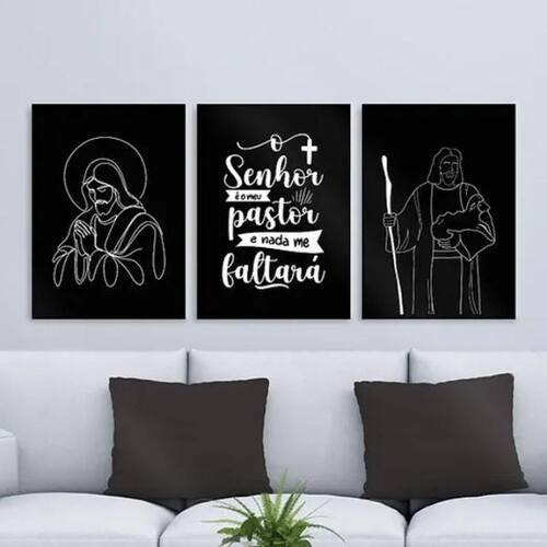 Kit 3 quadros modernos jesus - meu pastor 33x24cm Cor: moldura preta Informações do produto tire todas as suas dúvidas no descritivo abaixo: decoração para quarto, sala, cozinha, escritório, área gourmet e muito mais. Chega de paredes vazias medidas - cada peça tem 33x24cm a4 . Material do papel - papel fotográfico brilhante de altíssima resolução acabamento - todos os quadros são acompanhados de uma película de acetato para proteção da imagem. - os quadros são embalados de forma segura com plástico bolha com camada dupla de acordo com o tamanho dos quadros. Garantia - garantia de 3 meses. Meu quadro chegou. Como posso fixá-lo Você precisa apenas de um martelo e um prego, pois os quadros já vão acompanhados de penduradores. Esta é a forma mais indicada. Caso prefira, você pode utilizar uma fita dupla face neste caso, sugerimos de alta qualidade para evitar que descole e seu quadro caia . Como posso limpar meu quadro A limpeza é feita como um móvel comum da sua casa. Apenas um pano seco ou espanador são suficientes para tal