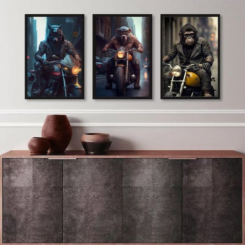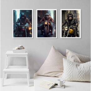 Kit 3 quadros motoqueiros animais 24x18cm Moldura: madeira branca Informações do produto tire todas as suas dúvidas no descritivo abaixo: decoração para quarto, sala, cozinha, escritório, área gourmet e muito mais. Chega de paredes vazias medidas - cada peça tem 24x18cm a5 . Material do papel - papel fotográfico brilhante de altíssima resolução acabamento - todos os quadros são acompanhados de uma película de acetato para proteção da imagem. - os quadros são embalados de forma segura com plástico bolha com camada dupla de acordo com o tamanho dos quadros. - de 3 meses. Meu quadro chegou. Como posso fixá-lo Você precisa apenas de um martelo e um prego, pois os quadros já vão acompanhados de penduradores. Esta é a forma mais indicada. Caso prefira, você pode utilizar uma fita dupla face neste caso, sugerimos de alta qualidade para evitar que descole e seu quadro caia . Como posso limpar meu quadro A limpeza é feita como um móvel comum da sua casa. Apenas um pano seco ou espanador são suficientes para tal Marca: Não Informado
