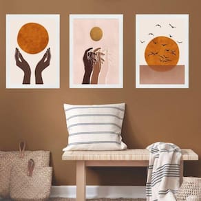Kit 3 quadros orgânicos boho - sol 24x18cm - com vidro Moldura: madeira branca Informações do produto tire todas as suas dúvidas no descritivo abaixo: decoração para quarto, sala, cozinha, escritório, área gourmet e muito mais. Chega de paredes vazias medidas - cada peça tem 24x18cm a5 . Material do papel - papel fotográfico brilhante de altíssima resolução acabamento - todos os quadros são acompanhados de vidro para proteção da imagem. - moldura em madeira maciça na cor preta ou branca conforme produto escolhido e pendurador . - os quadros são embalados de forma segura com plástico bolha com camada dupla de acordo com o tamanho dos quadros. Garantia - garantia de 3 meses. Meu quadro chegou. Como posso fixá-lo Você precisa apenas de um martelo e um prego, pois os quadros já vão acompanhados de penduradores. Esta é a forma mais indicada. Como posso limpar meu quadro A limpeza é feita como um móvel comum da sua casa. Apenas um pano seco ou espanador são suficientes para tal