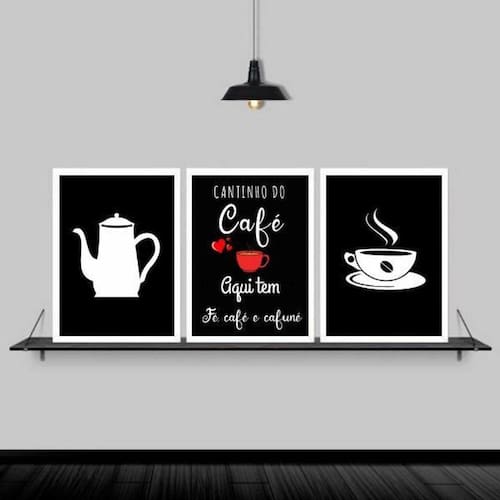 Kit 3 quadros para cantinho do café 24x18cm Moldura: madeira branca Informações do produto Decoração para quarto, sala, cozinha, escritório, área gourmet e muito mais. Chega de paredes vazias Medidas - cada peça tem 24x18cm a5 . Material do papel - papel fotográfico brilhante de altíssima resolução Acabamento - todos os quadros são acompanhados de uma película de acetato para proteção da imagem. - Os quadros são embalados de forma segura com plástico bolha com camada dupla de acordo com o tamanho dos quadros. Garantia - garantia de 3 meses. Meu quadro chegou. Como posso fixá-lo Você precisa apenas de um martelo e um prego, pois os quadros já vão acompanhados de penduradores. Esta é a forma mais indicada. Caso prefira, você pode utilizar uma fita dupla face neste caso, sugerimos de alta qualidade para evitar que descole e seu quadro caia . Como posso limpar meu quadro A limpeza é feita como um móvel comum da sua casa. Apenas um pano seco ou espanador são suficientes para tal