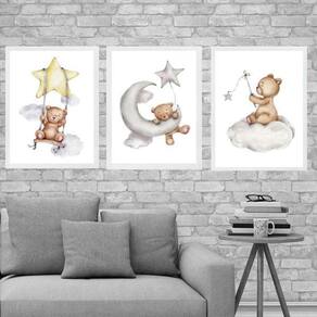 Kit 3 quadros para quarto de bebê ursinhos 45x34cm Moldura: madeira branca Informações do produto tire todas as suas dúvidas no descritivo abaixo: decoração para quarto, sala, cozinha, escritório, área gourmet e muito mais. Chega de paredes vazias. Medidas - cada peça tem 45x34cm a3 . Material do papel - papel fotográfico brilhante de altíssima resolução acabamento - todos os quadros são acompanhados de uma película de acetato para proteção da imagem. - os quadros são embalados de forma segura com plástico bolha com camada dupla de acordo com o tamanho dos quadros. - de 3 meses. Meu quadro chegou. Como posso fixá-lo Você precisa apenas de um martelo e um prego, pois os quadros já vão acompanhados de penduradores. Esta é a forma mais indicada. Caso prefira, você pode utilizar uma fita dupla face neste caso, sugerimos de alta qualidade para evitar que descole e seu quadro caia . Como posso limpar meu quadro A limpeza é feita como um móvel comum da sua casa. Apenas um pano seco ou espanador são suficientes para tal Marca: Não Informado