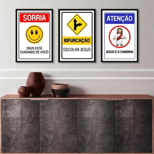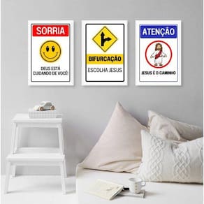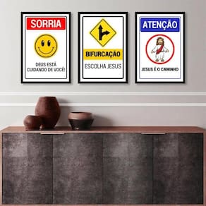 Kit 3 quadros placas cristãs - jesus 24x18cm Moldura: madeira preta Informações do produto tire todas as suas dúvidas no descritivo abaixo: decoração para quarto, sala, cozinha, escritório, área gourmet e muito mais. Chega de paredes vazias medidas - cada peça tem 24x18cm a5 . Material do papel - papel fotográfico brilhante de altíssima resolução acabamento - todos os quadros são acompanhados de uma película de acetato para proteção da imagem. - os quadros são embalados de forma segura com plástico bolha com camada dupla de acordo com o tamanho dos quadros. Garantia - garantia de 3 meses. Meu quadro chegou. Como posso fixá-lo Você precisa apenas de um martelo e um prego, pois os quadros já vão acompanhados de penduradores. Esta é a forma mais indicada. Caso prefira, você pode utilizar uma fita dupla face neste caso, sugerimos de alta qualidade para evitar que descole e seu quadro caia . Como posso limpar meu quadro A limpeza é feita como um móvel comum da sua casa. Apenas um pano seco ou espanador são suficientes para tal