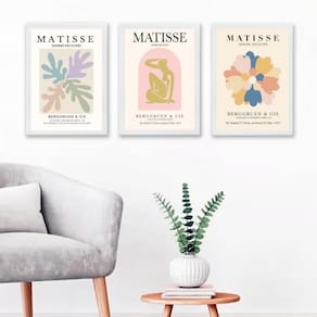 Kit 3 quadros posters matisse candy colors 45x34cm Moldura: madeira branca Informações do produto tire todas as suas dúvidas no descritivo abaixo: decoração para quarto, sala, cozinha, escritório, área gourmet e muito mais. Chega de paredes vazias. Medidas - cada peça tem 45x34cm a3 . Material do papel - papel fotográfico brilhante de altíssima resolução acabamento - todos os quadros são acompanhados de uma película de acetato para proteção da imagem. - os quadros são embalados de forma segura com plástico bolha com camada dupla de acordo com o tamanho dos quadros. Garantia - garantia de 3 meses. Meu quadro chegou. Como posso fixá-lo Você precisa apenas de um martelo e um prego, pois os quadros já vão acompanhados de penduradores. Esta é a forma mais indicada. Caso prefira, você pode utilizar uma fita dupla face neste caso, sugerimos de alta qualidade para evitar que descole e seu quadro caia . Como posso limpar meu quadro A limpeza é feita como um móvel comum da sua casa. Apenas um pano seco ou espanador são suficientes para tal