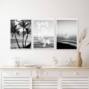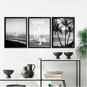 Kit 3 quadros praia preto e branco gentileza 45x34cm - com vidro Moldura: madeira preta Informações do produto tire todas as suas dúvidas no descritivo abaixo: decoração para quarto, sala, cozinha, escritório, área gourmet e muito mais. Chega de paredes vazias medidas - cada peça tem 45x34cm a3 . Material do papel - papel fotográfico brilhante de altíssima resolução acabamento - todos os quadros são acompanhados de vidro para proteção da imagem. - moldura em madeira maciça na cor preta e pendurador . - os quadros são embalados de forma segura com plástico bolha com camada dupla de acordo com o tamanho dos quadros. Garantia - garantia de 3 meses. Meu quadro chegou. Como posso fixá-lo Você precisa apenas de um martelo e um prego, pois os quadros já vão acompanhados de penduradores. Esta é a forma mais indicada. Como posso limpar meu quadro A limpeza é feita como um móvel comum da sua casa. Apenas um pano seco ou espanador são suficientes para tal Ean: 7898448318466